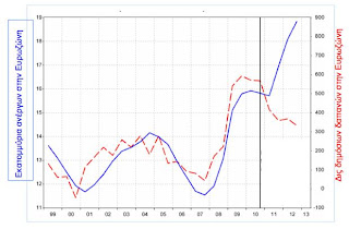 | δεν ακουγετε καλα ! πολυ σιγανα ! Added (28-ΙΟΥ-2013, 9:26 AM) --------------------------------------------- Ένα διάγραμμα - 10.000 λέξεις. Του Γιάννη Βαρουφάκη Η εγκληματική ανοησία που χαρακτηρίζει σήμερα την οικονομία της Ευρωζώνης δεν χρειάζεται παρά ένα διάγραμμα για να εμφανιστεί σε όλο της μεγαλείο. Η μπλε γραμμή καταγράφει τον αριθμό των ανέργων κατοίκων της Ευρωζώνης από το 1999 μέχρι σήμερα. Η κόκκινη τις δημόσιες δαπάνες (σε δισ. ευρώ) για την ίδια περίοδο...